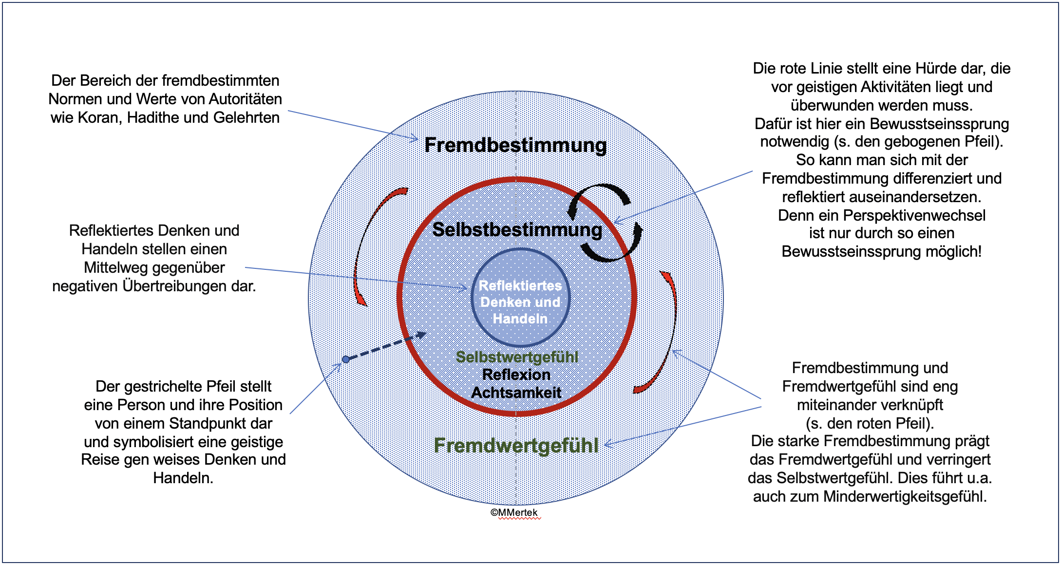 Jeder Mensch befindet sich in seiner individuellen Position innerhalb dieses Entwicklungsprozesses. Einige Menschen verharren in der Fremdbestimmung, andere haben bereits begonnen, sich der Selbstbestimmung zu nähern. Erst wer den Bewusstseinssprung vollzieht, kann einen wirklichen Perspektivenwechsel vollziehen und über die Fremdbestimmung hinaus nachdenken. Eine solche Person erkennt die ethischen Anforderungen nicht bloß von außen, sondern beginnt, sie aus innerer Überzeugung heraus zu leben. Die Reflexion über Werte wird zum Bestandteil des eigenen Selbst (s. den gestrichelten Pfeil). Viele Muslime, die dies nicht verwirklichen, begnügen sich damit, nur im Bereich der Fremdbestimmung zu bleiben.