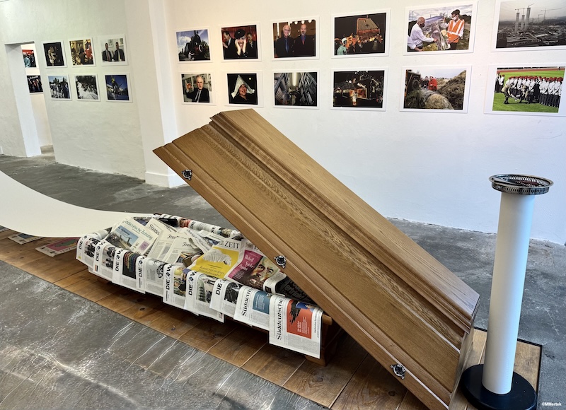 Doch das eigentlich Erschütternde war ein hölzerner Sarg in der Mitte eines Raumes, dessen drei Wände mit Fotografien bedeckt waren. Im offenen Sarg lagen übereinandergestapelte Zeitungen und ein Buch, am Kopfende zwei Smartphones… Kein Kommentar nötig: Die Zeitungen symbolisierten den schwerfälligen Nachrichtenfluss der Vergangenheit; die Smartphones die schnelle, schwindelerregende Aktualität von heute. Und das Buch schaute uns mitten in all diesem Trubel in stiller Einsamkeit an.